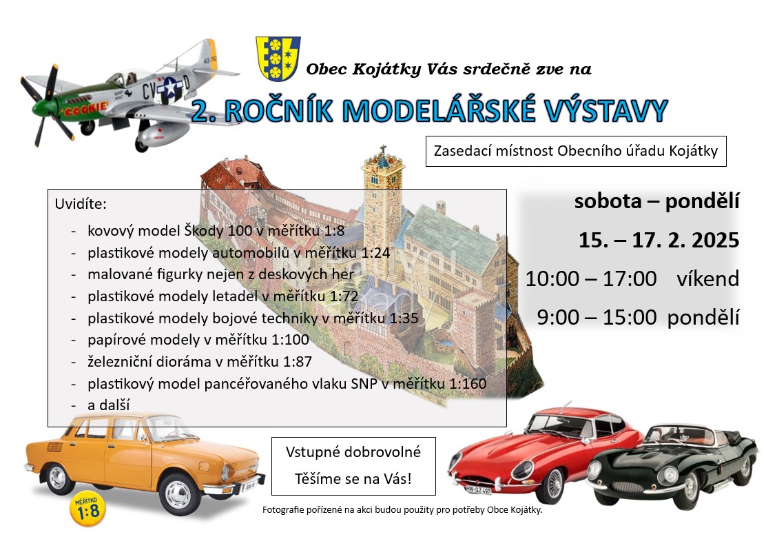 Navštivte výstavu modelů, která se koná od 15. do 17. února 2025. Na akci si můžete prohlédnout kovové a plastikové modely, papírové modely v měřítku 1:100 a železniční dioráma v měřítku 1:87. Víkendové otevírací hodiny jsou od 10:00 do 17:00 a pondělní od 9:00 do 15:00.